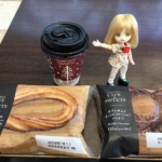 ファミリーマート 牛乳仕込みのミルクチュロッキー、ダブルチョコオールドファッションドーナツ、ブレンドコーヒー