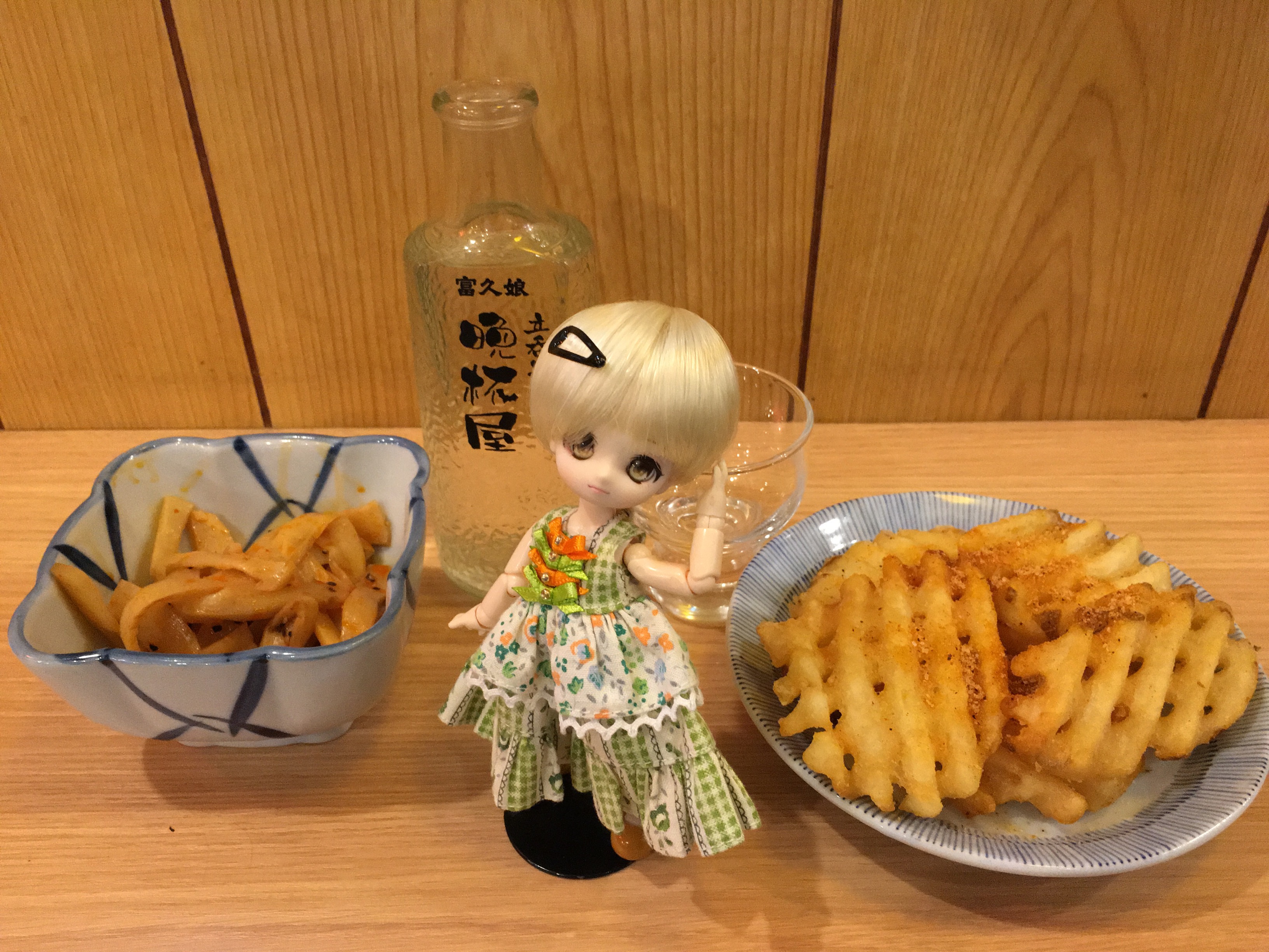 冷酒(\370)、黒こしょうメンマ(\130)、ニューポテトフライ(\150)