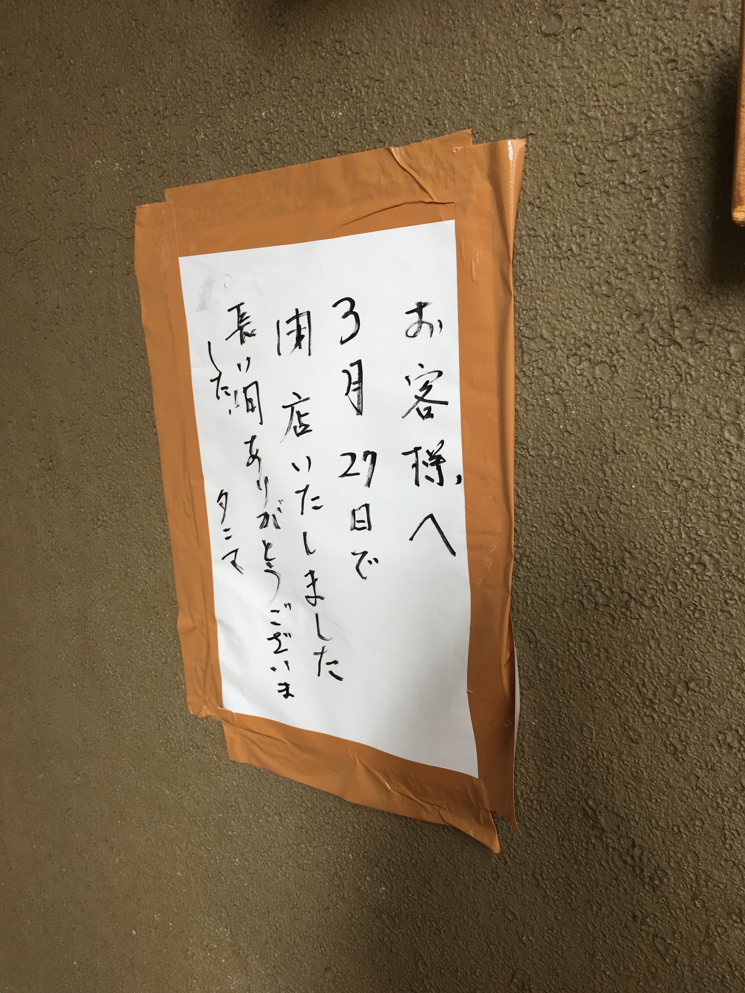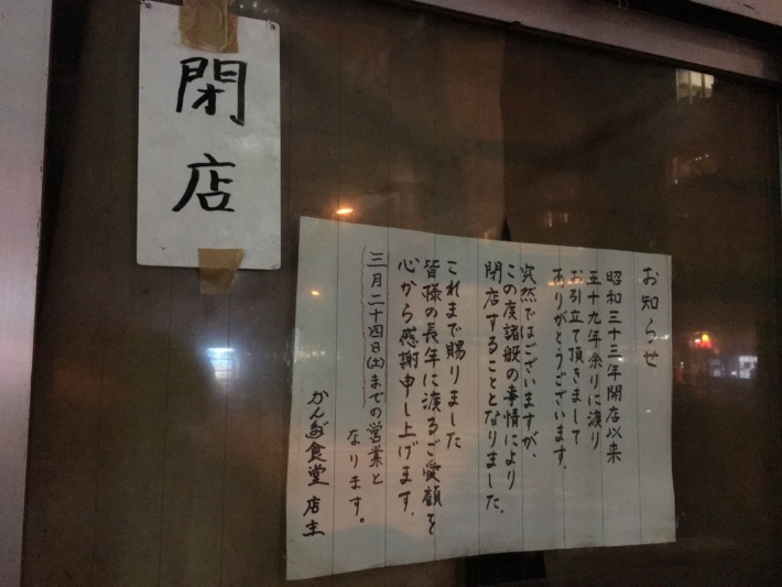ちなみにすぐ隣の神田食堂も先月下旬で閉店してました。こちらは25年以上「いつか入ろう」「いつか食べよう」と思い続けたまま、結局一度も食べることなく閉店してしまいました。これはまあ笑い話ですが、気になる店、気に入ってる店は後回しにせずきちんと来店しておくべきですね。閉店時の後悔を少しでも軽くするために。