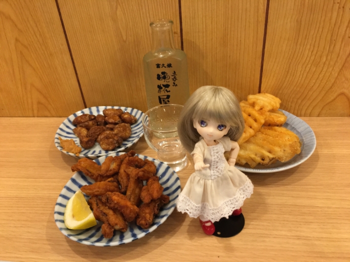 揚げにんにく串(\130)、冷酒(\370)、ニューポテトフライ(\150)、
