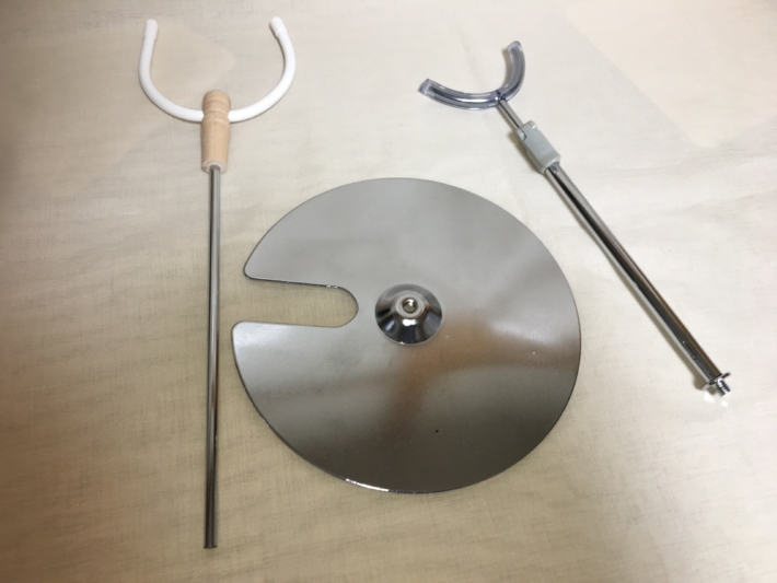 つなげるスタンドはこれです。去年イベントで買ったものですが、どこのディーラーさんのだったかは失念してしまいました。左の腰支え用支柱は今回使いません。なんとなく一緒に並べただけです。中央の台座と、右の台座接続支柱+サドル型支柱を使います。キモは台座接続支柱の形状なので、もちろん用途によって腰支え支柱とサドル型支柱を入れ替えることは可能です。