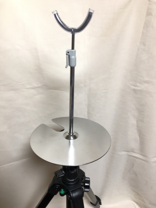 アダプタを使ってドールスタンドを三脚につなぐとこんな感じ。