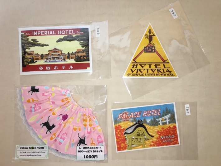 Yellow Green HOMEさんのMDD用ミニスカートを一着とY’S GOOD COLLECTIONさんのステッカー3枚。ドルパ直前ということでかなり抑えめでした。ドルパでオビツ11用の服は期待できないから、買うならこのタイミングだったのですが、I-doll52で買ってきた服もまだ着せてないので自重しました。
