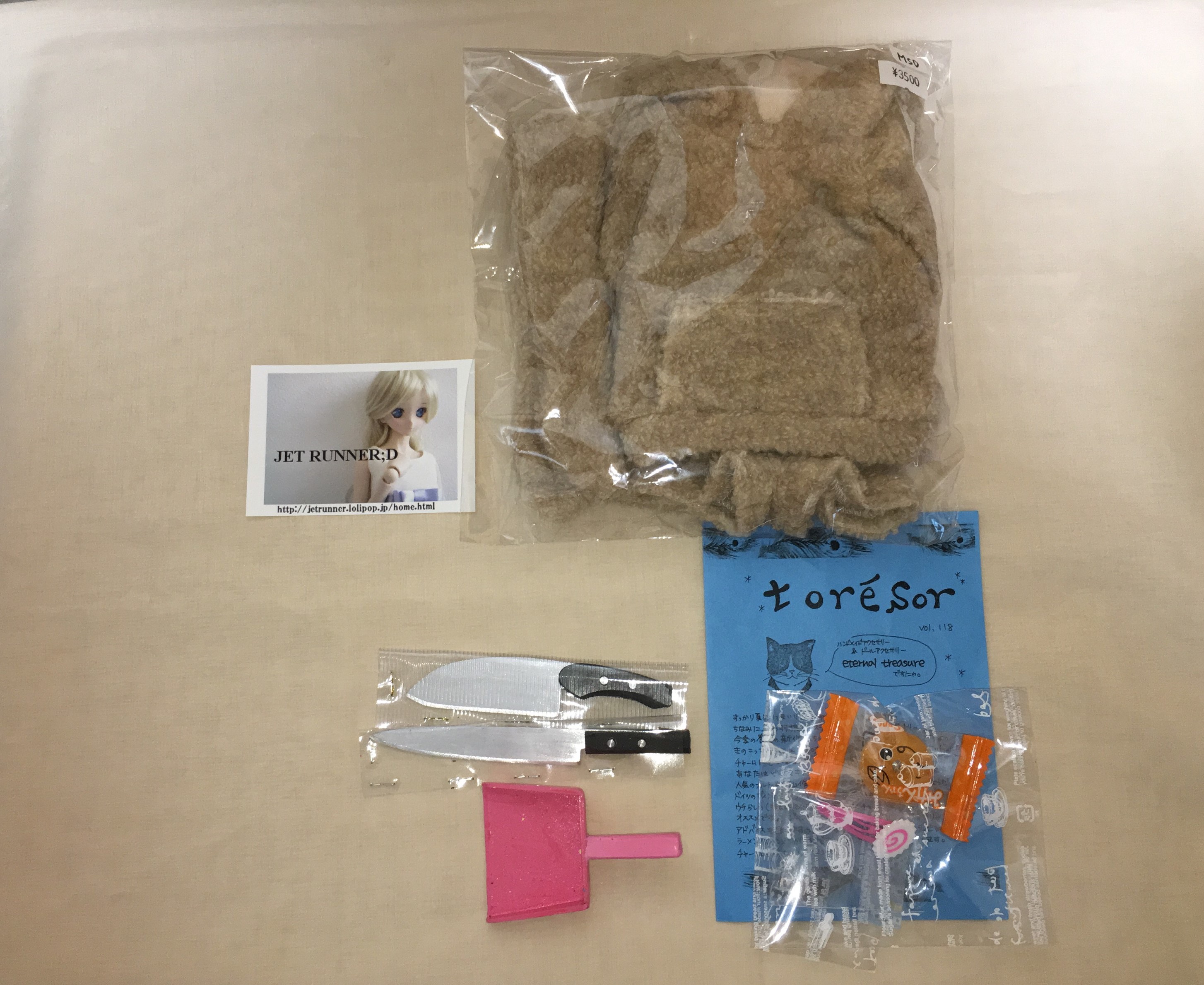 JET RUNNER;Dさんの くまルームウェアセット、虚頭怪談さんの包丁2本とおまけのチリトリ、eternal treasureさんの なるとパッチンピン。