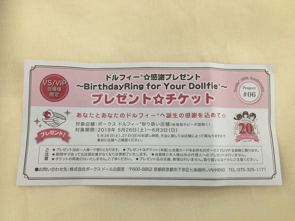 昨日(5/28)詳細に気付いたドルフィーバースデーリングですが、今日(5/29)秋葉原ボークスへ引き換えに行ったら既に在庫切れ終了でした。うーん。。。特に怒ってはいません。悔しくも悲しくもないです。ただ呆れてるだけです。