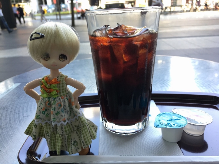 今ぐらいの気候は暑くも寒くもなく、外でお茶するのにちょうど良いです。もちろん日陰に座ること前提で。この店のこの席はずっと日陰なのは良いのですが、ビル風っぽいのが吹くタイミングがあるので髪の長いドールで写真撮るのは難しいです。なので安直に のりたま(アンジェリカ)さんの出番と相成ります。