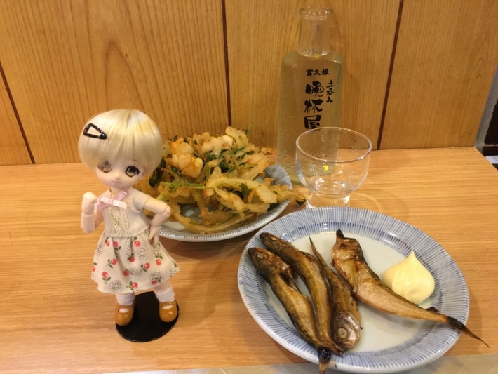 冷酒、小柱のかき揚げ、ハタハタの丸干し
