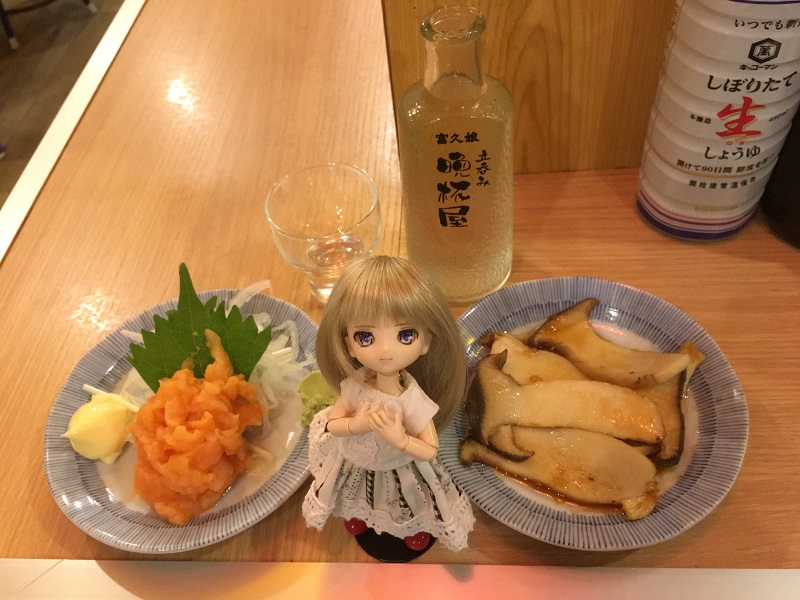 冷酒、エリンギぽん酢、鮭の中落ち