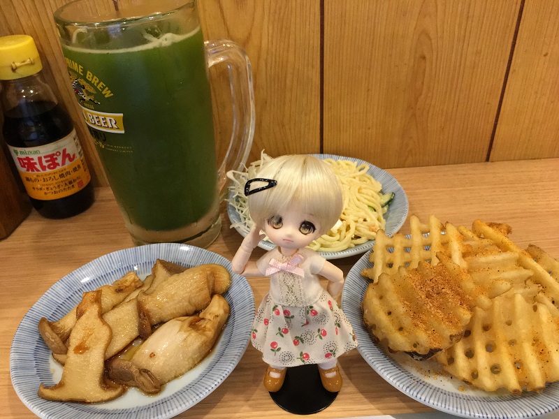 緑茶割り、エリンギぽん酢、ニューポテトフライ、スパサラ