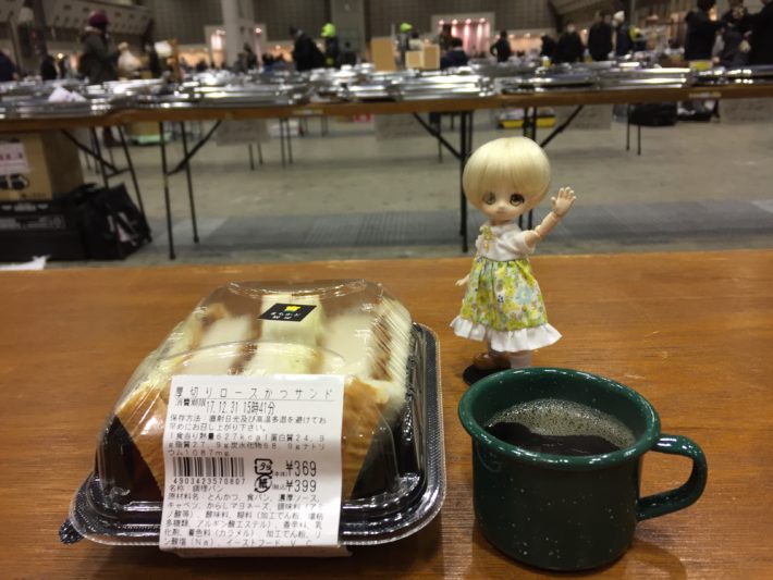 時刻は朝7時半。サークル入場してスペース設営前にとりあえず朝食。この写真では背景がらがらですが、この数十分後、前方3ブロックほど先の通路に結構な規模の開場前行列が出来ます。