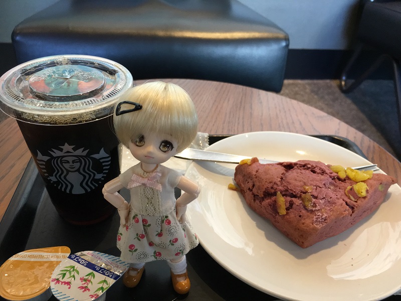 「赤紫色のスコーンとか、ハロウィン仕様かな?」などと考えて頼んでみましたが、単にサツマイモを使ってるだけかもしれませんね。あ、いや、でもサツマイモってアメリカでも流通してるのかな。。。まあ、何にせよ品名通り、ほんのりスイートポテトっぽい風味のするスコーンでした。かなり好みです。チョコチップが入ってるのより好きかも。