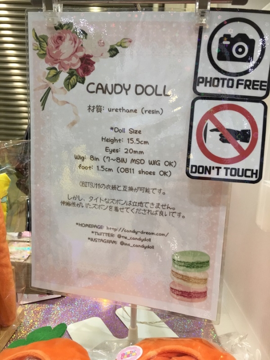 ディーラーさんに教えてもらったところ、CANDY DOLLというフォーマットの海外ドールだそうです。ボディはオビツ11の服が着まわせるサイズ、ヘッドは見た感じドルチェ様のヤミーくらいの大きさでした。