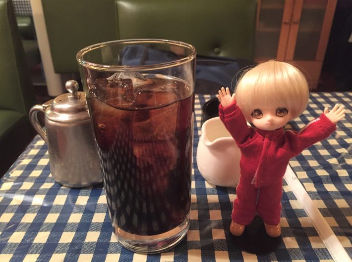 それはさておき、かなり初期に撮った写真です。ポーズが固いし、何より長袖を着せている点が決定的に今と違います。オビツ11は肩も肘も外れやすいので半袖を着せるのが自分なりの今の鉄則なんです。半袖なら腕が取れても服を脱がせずにサッと差し込み直せますから。店内で人形出してお酒やご飯と一緒に写真撮るくらいなら平気で出来ますが、人前で服を脱がせたり着せたりするのは流石に無理です。キツイです。