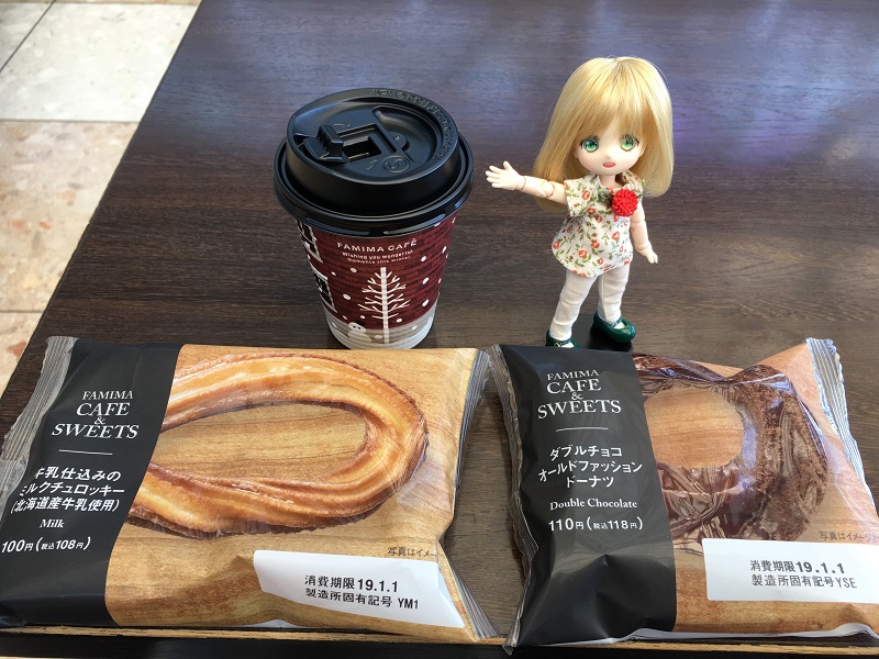 ファミリーマート 牛乳仕込みのミルクチュロッキー、ダブルチョコオールドファッションドーナツ、ブレンドコーヒー