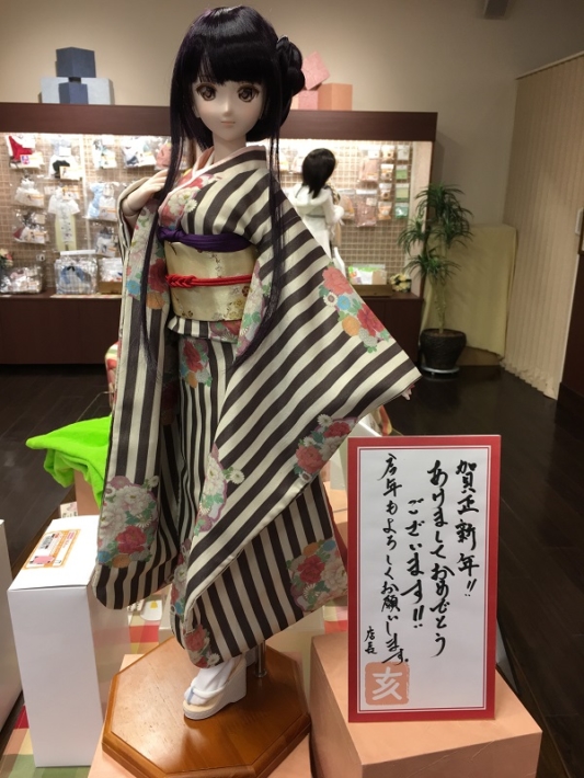 新年のご挨拶ドールがいました。元旦に来た時既にいたとしたら絶対気付いてるはずなので正月2日からの登板なのでしょう。さておき、晴れ着にしては色合いが地味です。そういえばボークスって晴れ着の類を商品として出してましたっけ?