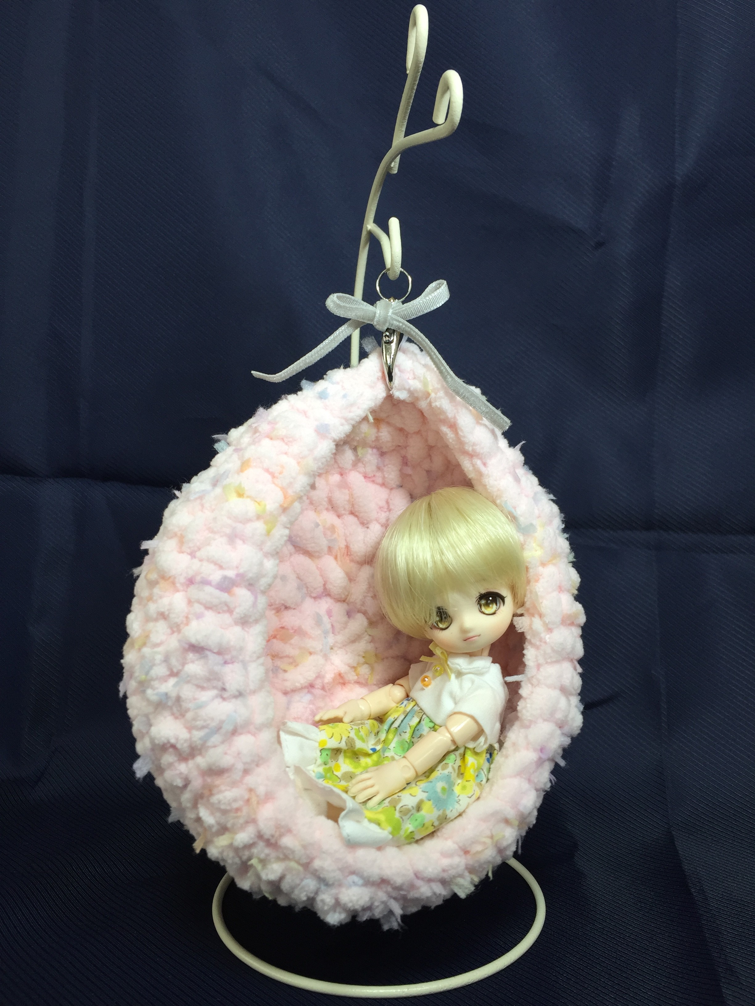 ドルショ52で買ってきたcapito knitさんのドール用コクーンチェアにアンジェリカさんを試乗させてみました。こんな感じですっぽり入れる場合は1体でちょうどっぽい。正面向いて並んで座れば2体いけるかな