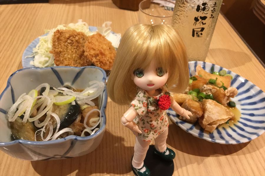 冷酒(\370)、まぐろカツ(\250)、鶏となすの旨煮(\150)、ぶりの唐揚げ(\250)