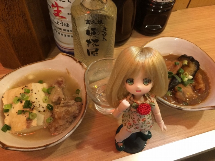 冷酒(\370)、牛テール出汁の肉豆腐(\180)、鶏となすの旨煮(\150)、タコの唐揚げ(\200)