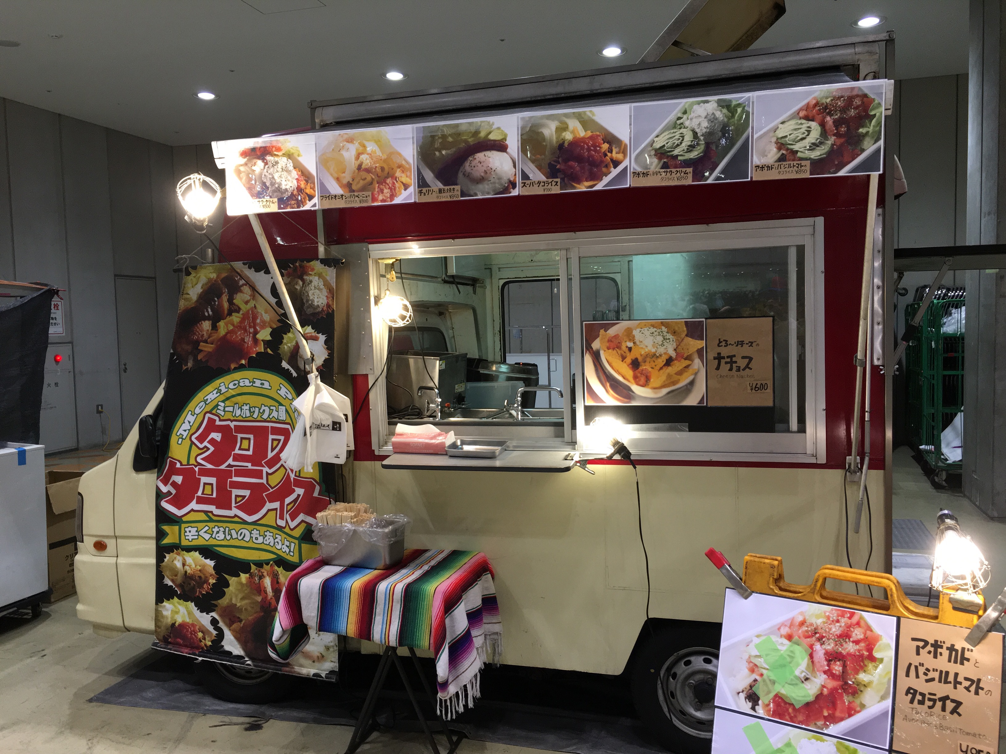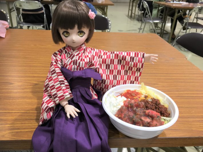冬コミで食べた屋台の丼物でも使われてた覚えのあるこの使い捨て容器ですが、見た目以上にしっかりご飯が入る為、量的な不満が出ることはありません。大満足です。お味の方も、トマトをメインとした味ながら酸っぱすぎず、トマト・挽き肉・チーズ・サワークリームが調和した質の高い仕上がりでした。特に辛いというわけではないのですが、赤い色素の強いソースが多い為、下の方のご飯は真っ赤っかになってました。食前にテーブル拭くティッシュとは別に、食後に口拭くティッシュも必要です。