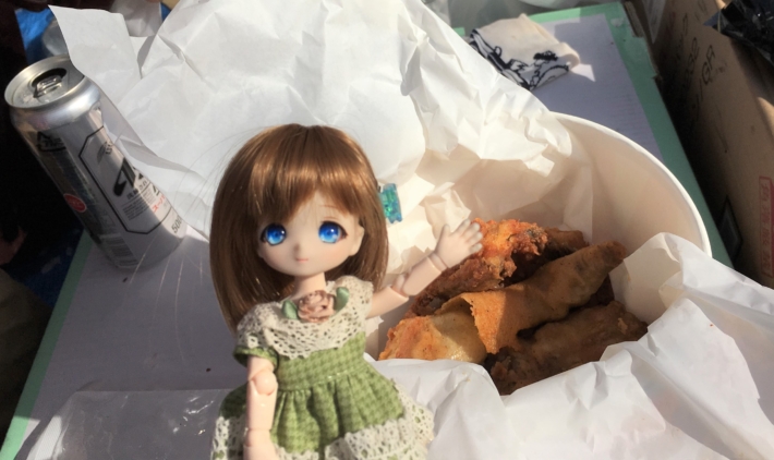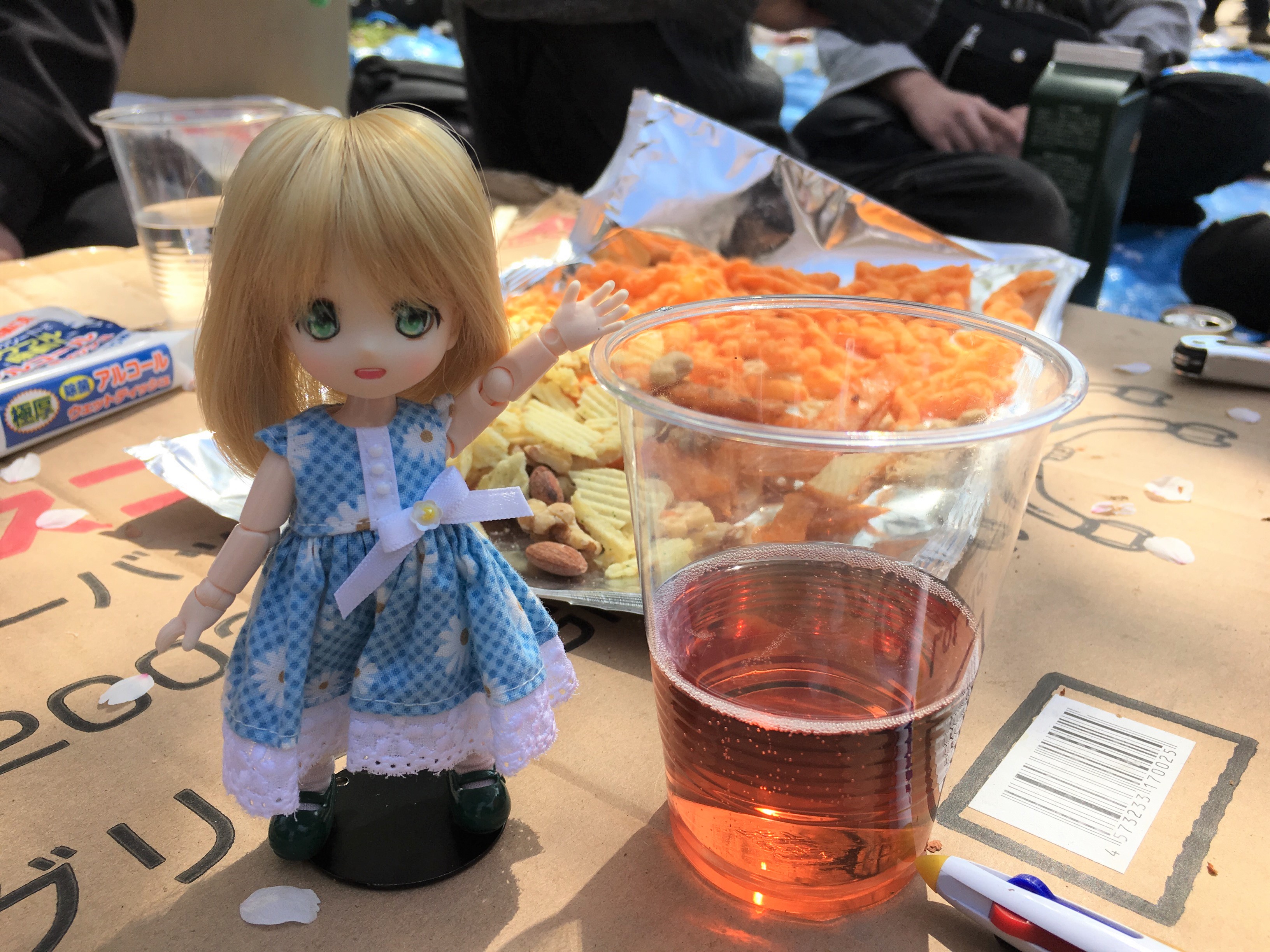 プラコップに入ってるのは誰かが持ってきたロゼワイン。バックには乾き物が色々。そしてドールの足元には桜の花びら。思い付きで雑に撮った割には良い感じの写真になりました。余談ですが桜はバラ科だそうです。ということはロゼワインは雰囲気的にピッタリですね。