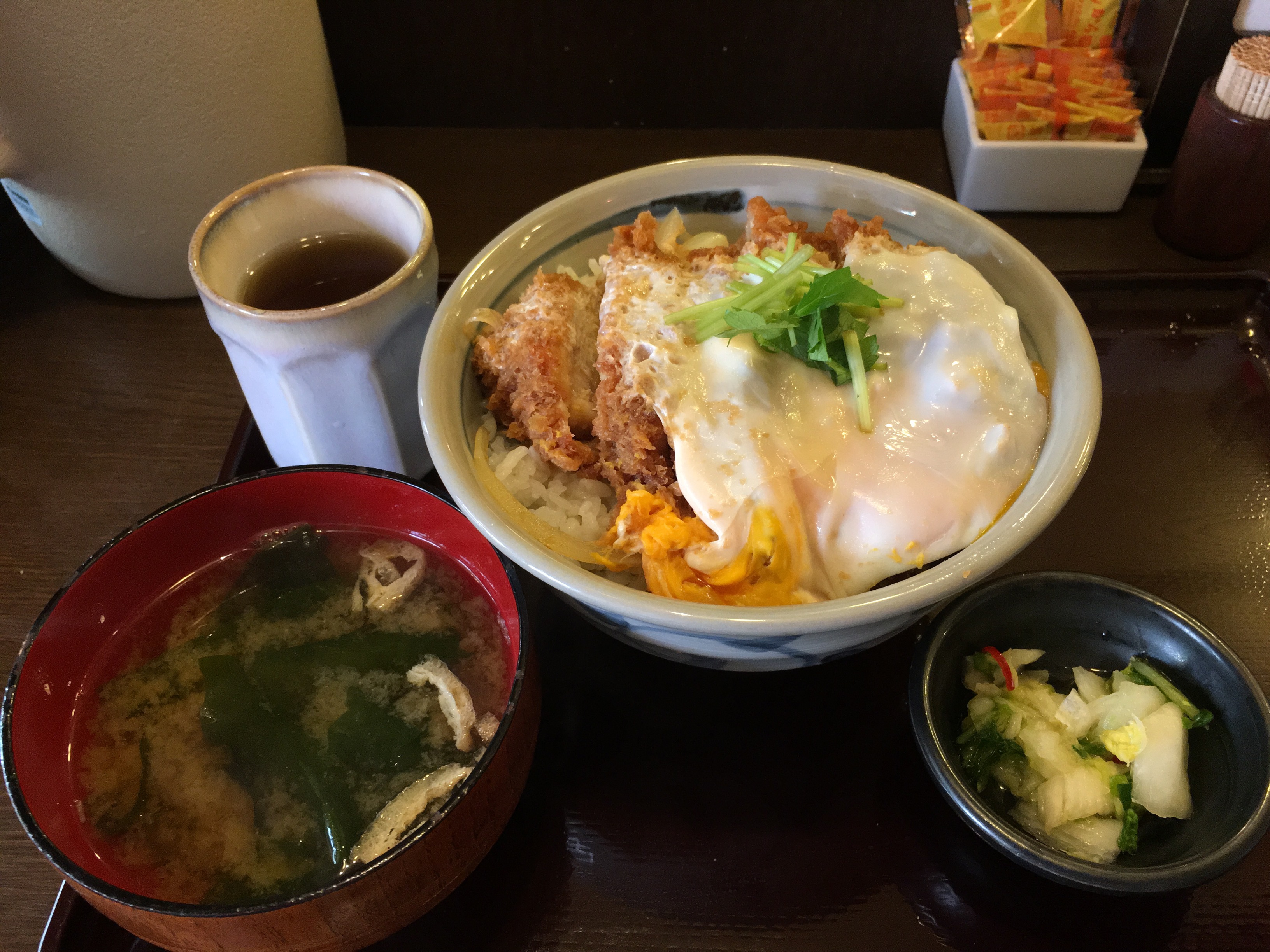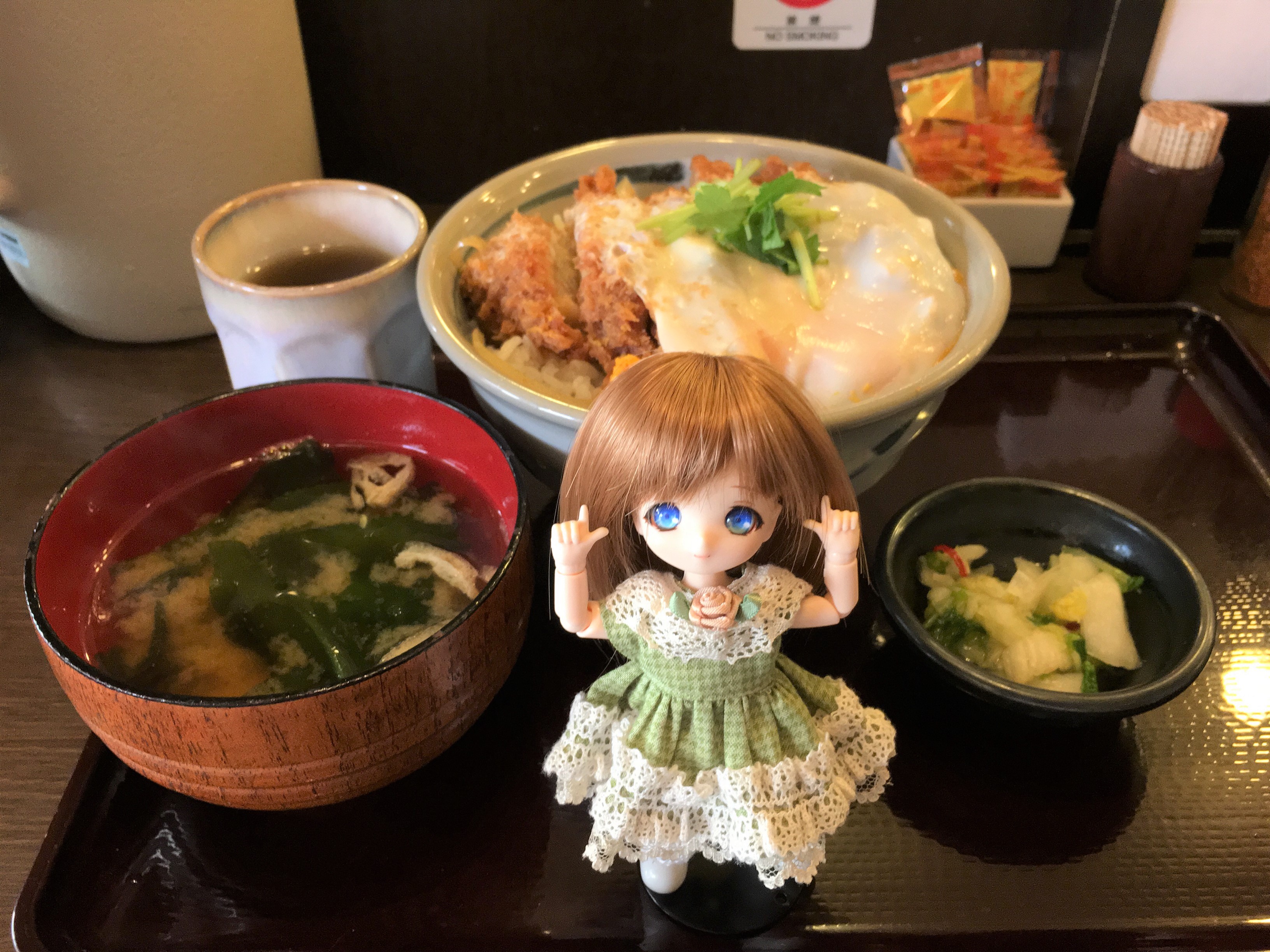ドールと一緒の写真はかつ丼が少しボケてたので、ドール無しで撮った写真もついでに載せておきます。卵の部分の処理が独特で、白身と黄身があまり混ざっておらず、しっかり火が通ってる感じです。ぱっと見、目玉焼きが乗ってるようにも見えますが、きちんとしたかつ丼の卵です。意外性はないけどしっかり正統派のかつ丼といった感じで、とても美味しかったです。